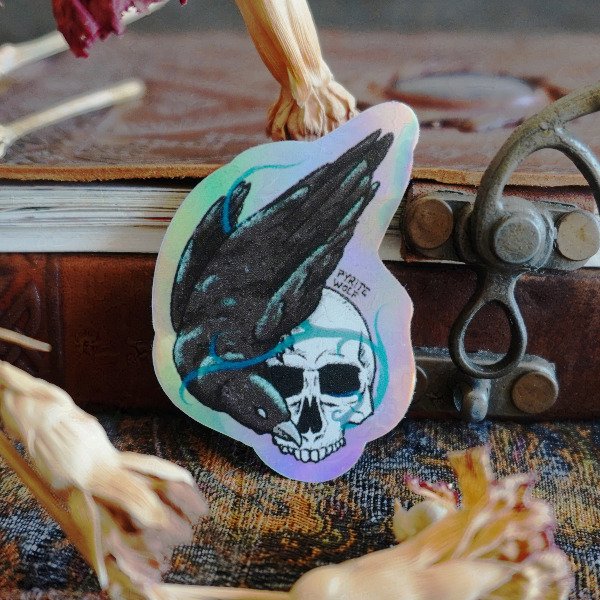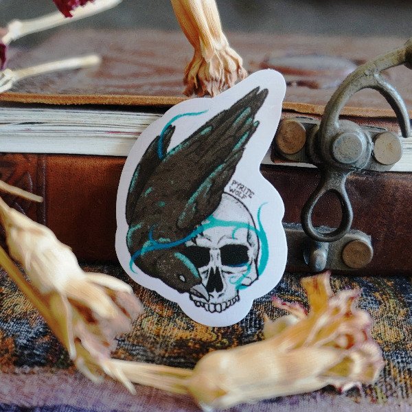 Ilustración de un cuervito con una calavera completamente libre de espíritus, ¡no sé por qué preguntás!